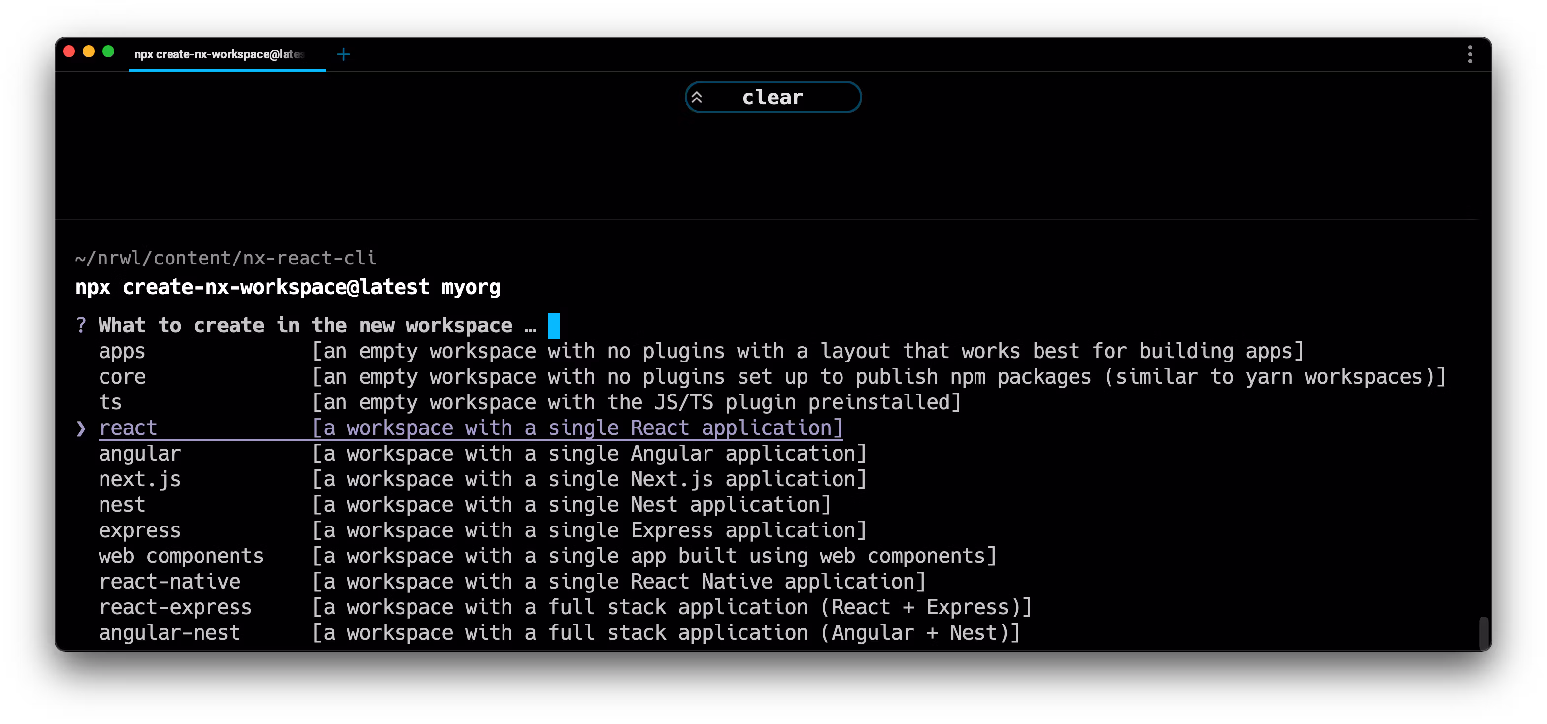 npx create-nx-workspace@latest myorg